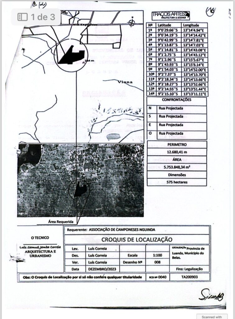 - Este croquis foi emitido em 2023, no perímetro definido em 2022 como reserva do Kilamba e inclui áreas do KK5800, com construções e sinalização da sua condição como pertença do Estado e numa altura em que já haviam recomeçado as obras, logo, só pode ser o resultado de uma associação criminosa.